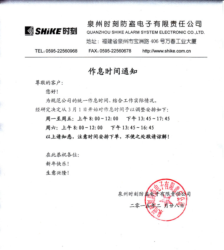作息時(shí)間更改通知