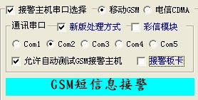 接警軟件的通訊串口需選擇正確,在接警軟件系統(tǒng)里面的通訊設(shè)置,必須把‘新版處理方式’、‘彩信模塊’、‘接警版卡’三項(xiàng)須全部選上。如下圖所示: